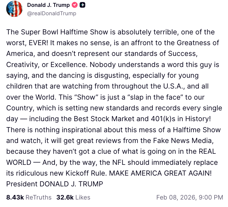 This "Show" is just a "slap in the face" to our Country, which is setting new standards and records every single day — including the Best Stock Market and 401(k)s in History! There is nothing inspirational about this mess of a Halftime Show and watch, it will get great reviews from the Fake News Media, because they haven't got a clue of what is going on in the REAL WORLD — And, by the way, the NFL should immediately replace its ridiculous new Kickoff Rule. MAKE AMERICA GREAT AGAIN! President DONALD J. TRUMP