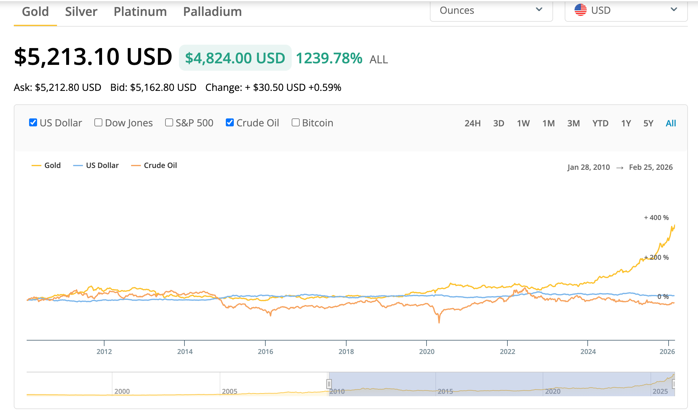 Now look at where it is compared to the U.S. Dollar and crude oil.